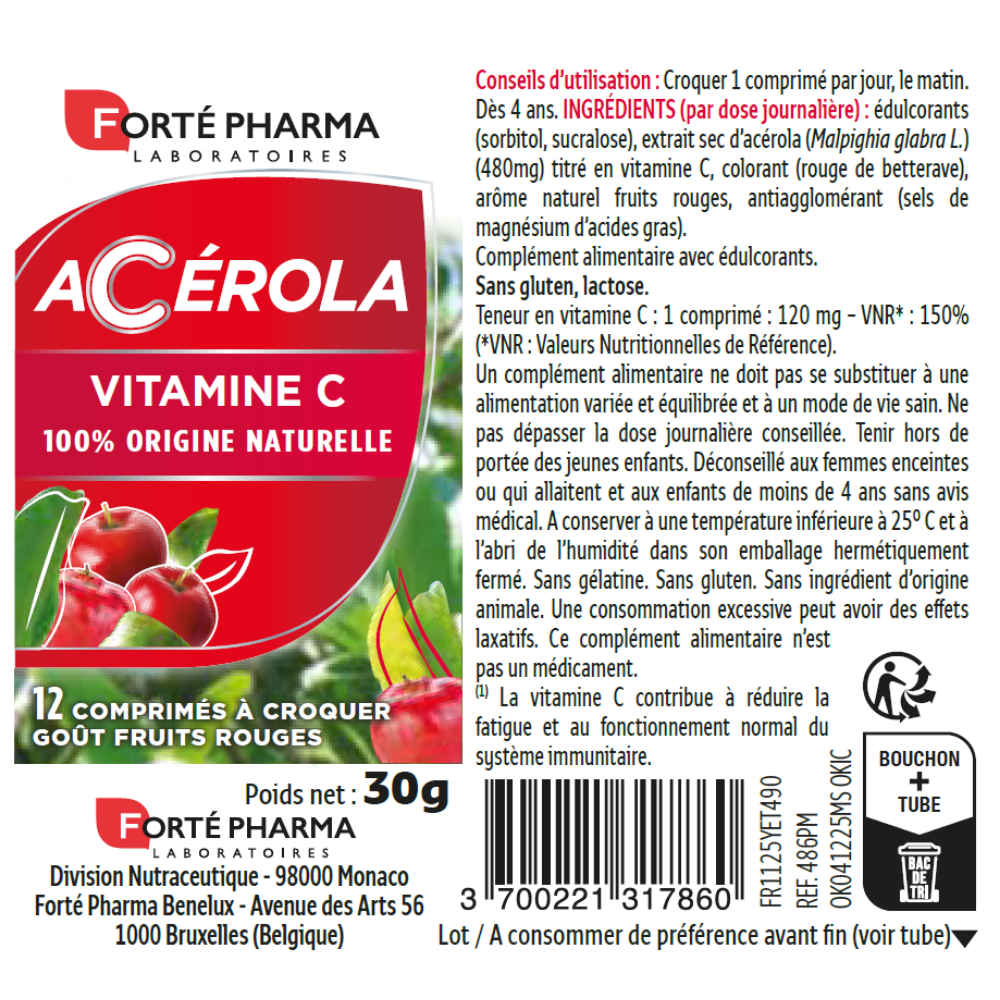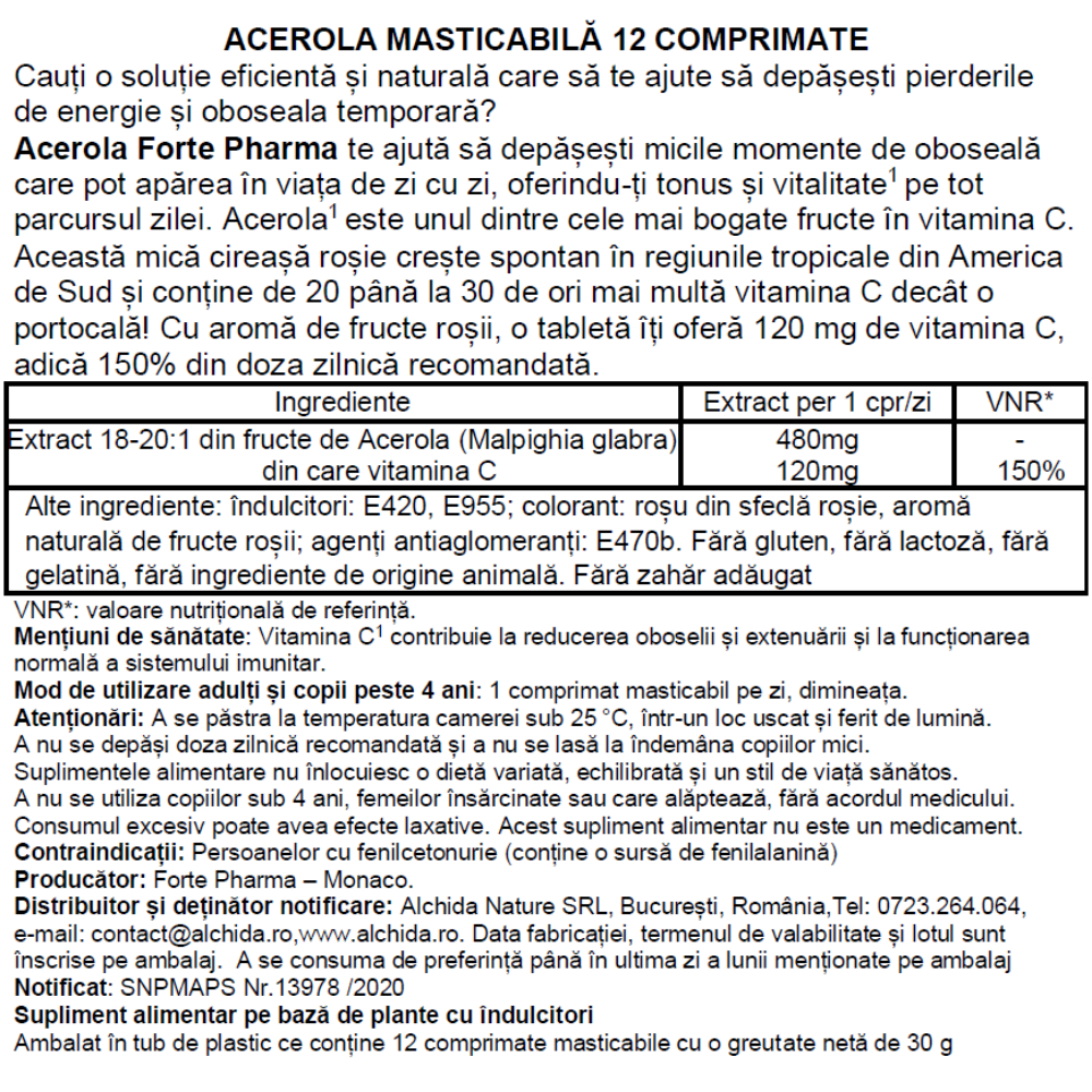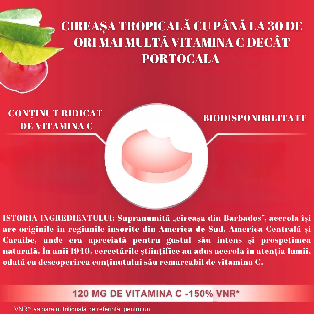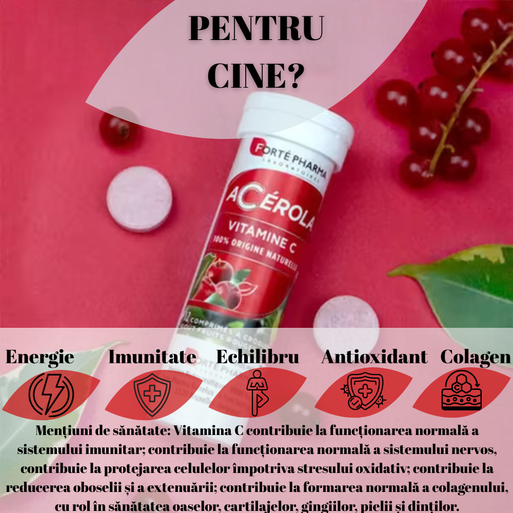 Acerola este o sursă de cea mai buna calitate de vitamina C, fară acid ascorbic sintetic, cu un gust delicios de fructe roșii, fară zahăr adăugat. Fara gluten, gelatina si lactoza.