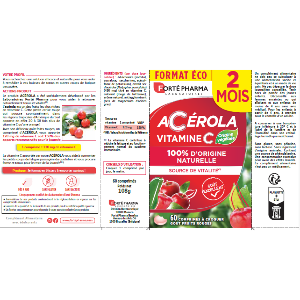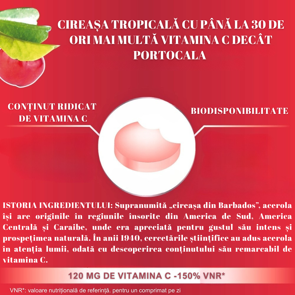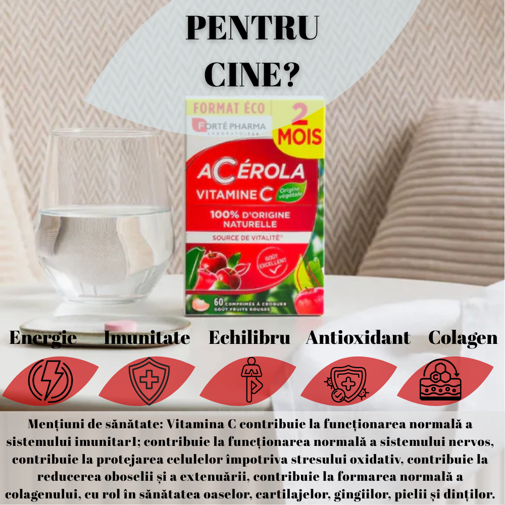 Acerola este o sursă de cea mai buna calitate de vitamina C, fară acid ascorbic sintetic, cu un gust delicios de fructe roșii, fară zahăr adăugat. Fara gluten, gelatina si lactoza.
