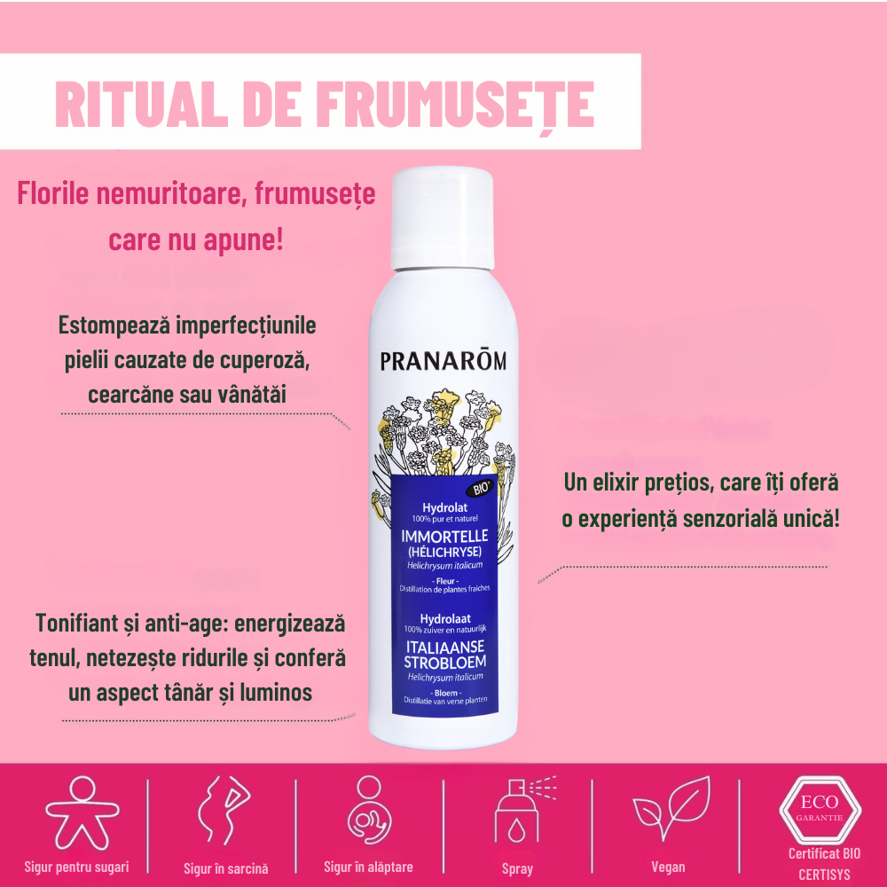 Obținut prin distilarea delicată a florilor proaspete de Helichrysum Italicum, acest hidrosol 100% pur păstrează proprietățile excepționale ale plantei, oferind o experiență de îngrijire autentică și eficientă.