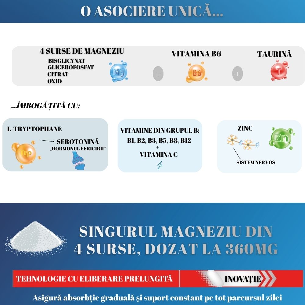 Magneziul, Taurina și L‑Triptofanul contribuie la echilibrul organismului și starea de bine. Un somn de calitate și pauze regulate amplifică efectul lor asupra energiei mentale și a stării generale.