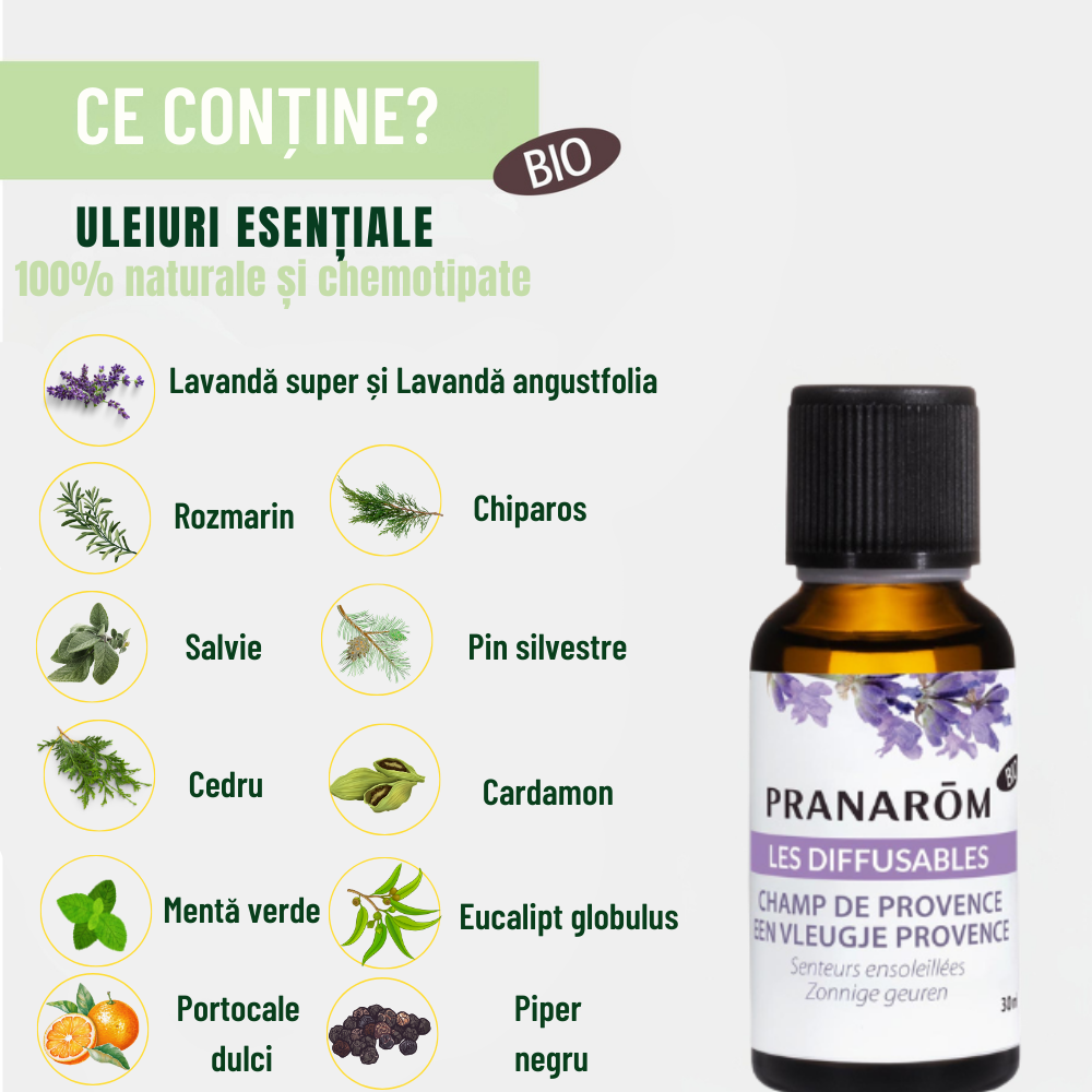Ambianță armonioasă în locuință sau la birou: difuzarea acestui blend evocă parfumul însorit al Provence-ului, aducând un echilibru olfactiv floral, lemnos și condimentat, ideal pentru orice spațiu dedicat relaxării și refacerii.