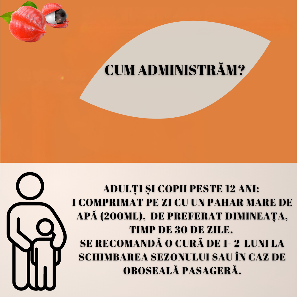 1 comprimat dublu-strat pe zi, dimineața împreună cu un pahar mare de apă (200ml) timp de 30 de zile. Se recomandă cure de 1-2 luni sau la fiecare schimbare de sezon sau oboseală pasageră.