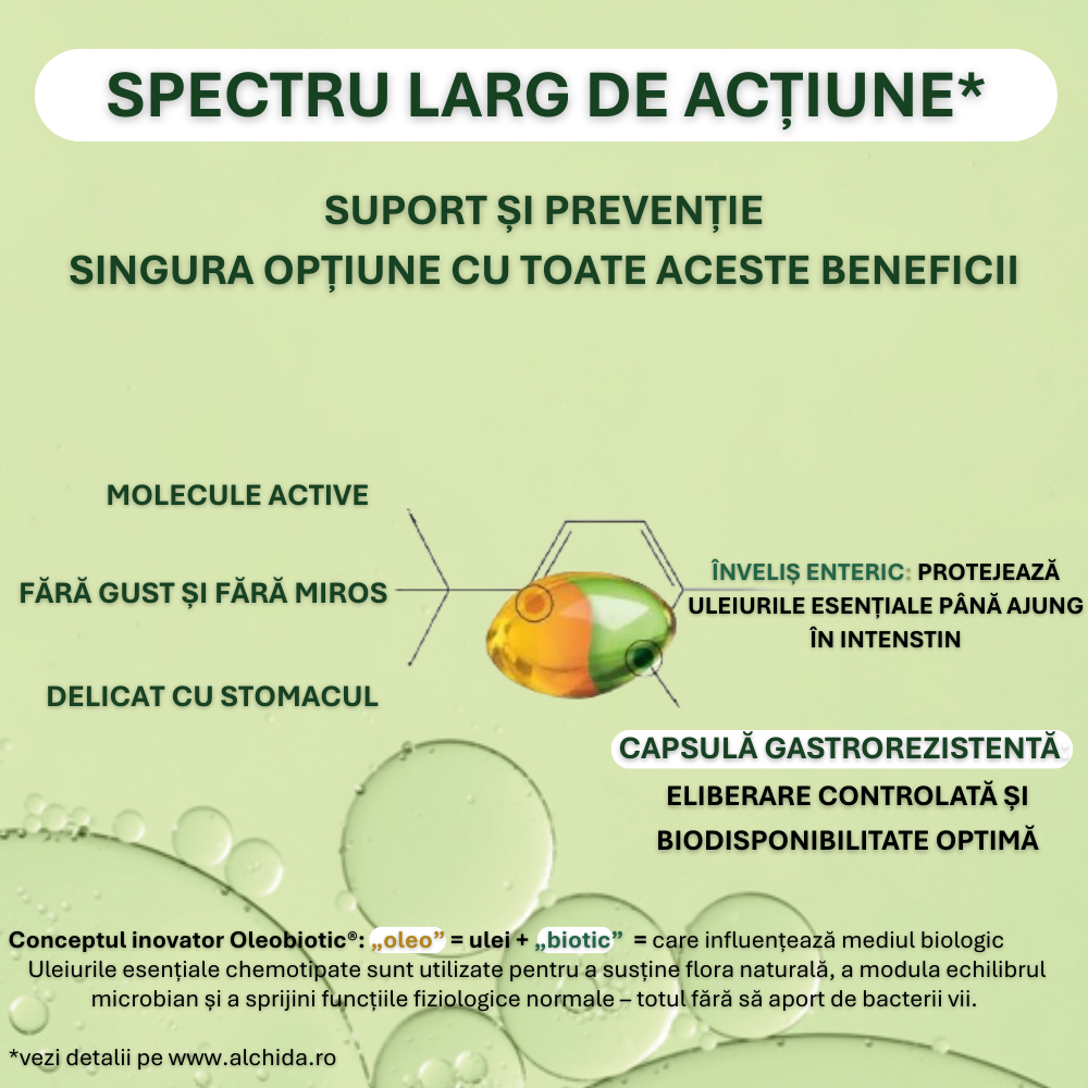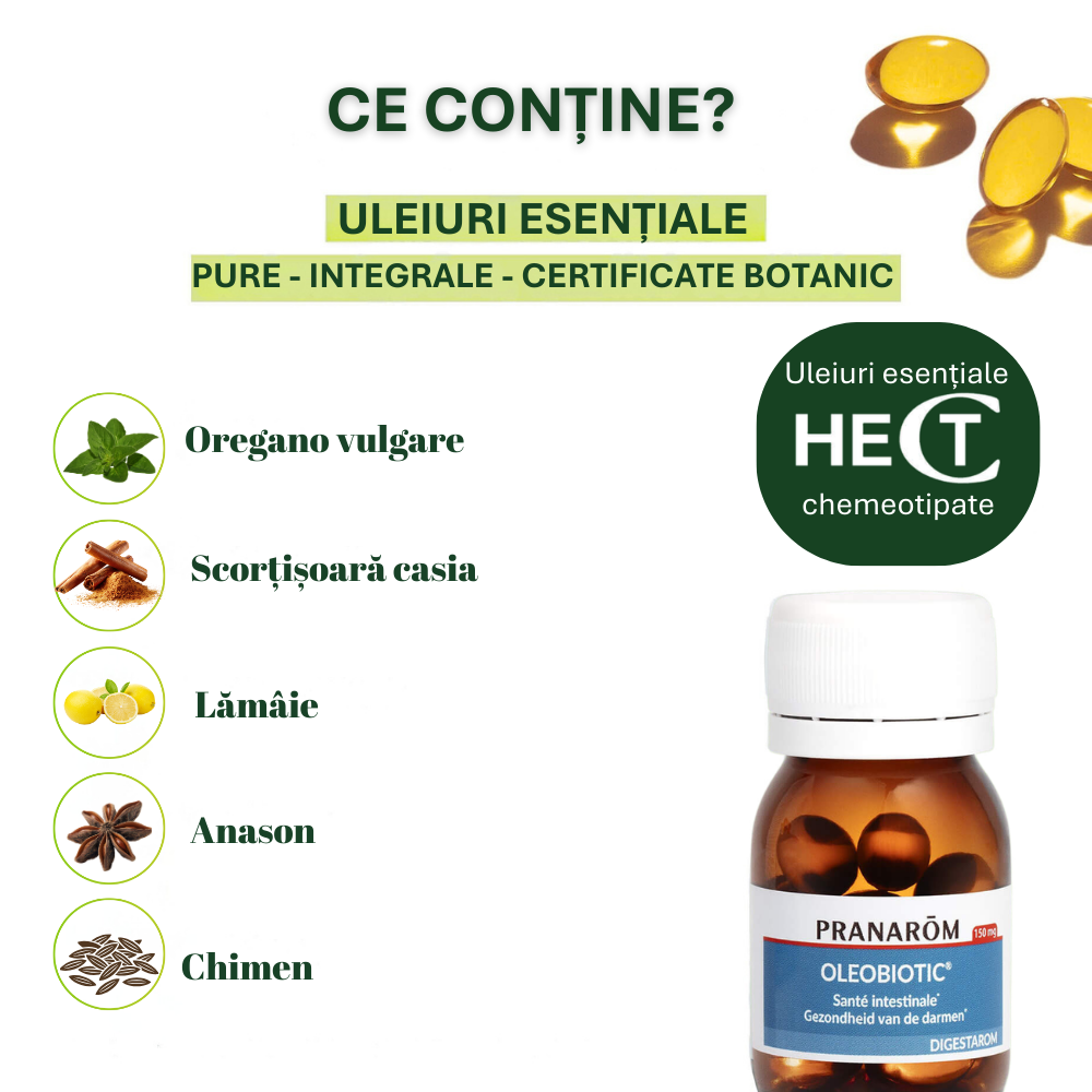Capsulele moi gastrorezistente protejează uleiurile esențiale chemotipate până ajung în intestin, asigurând eliberare imediată și biodisponibilitate optimă.