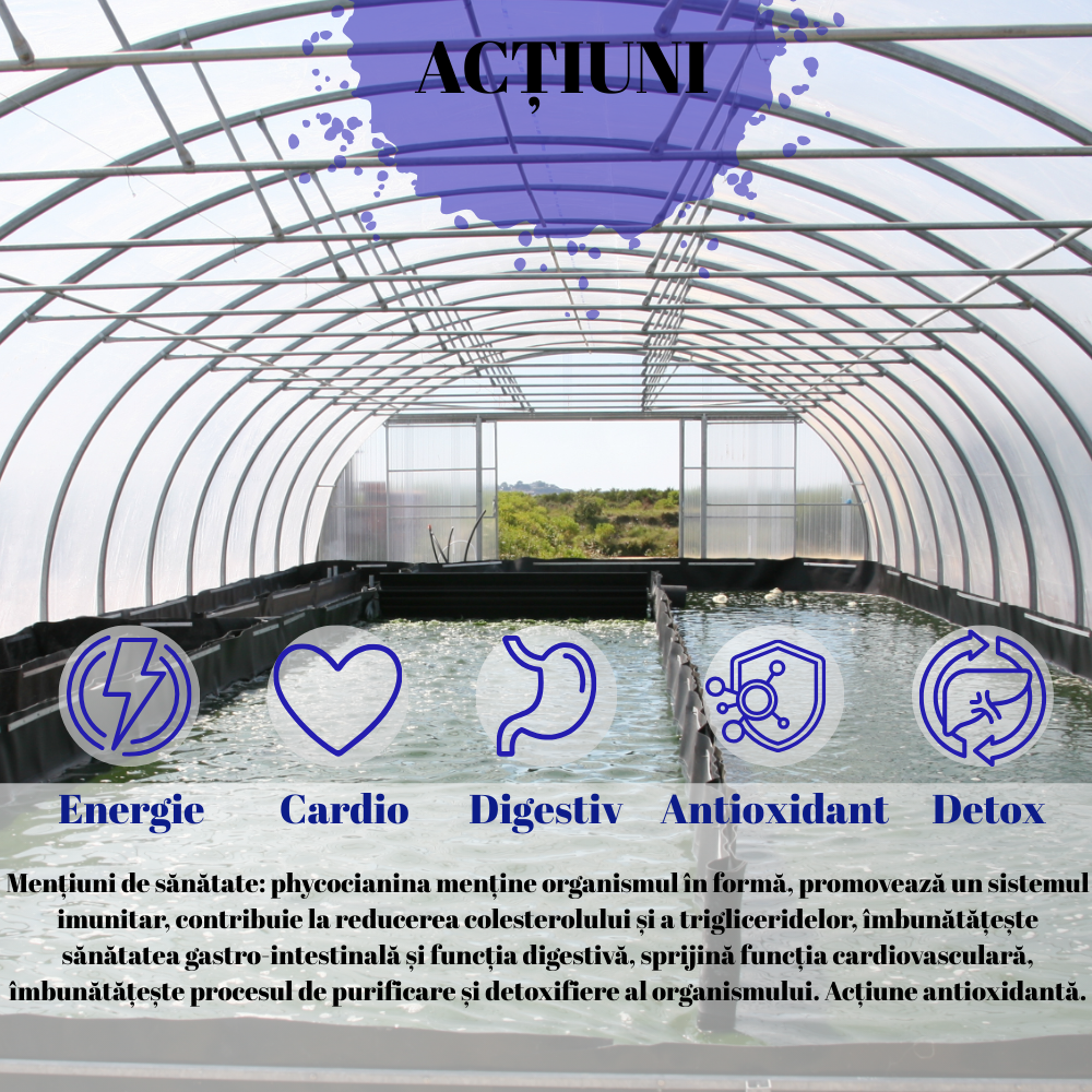 Nu Spirulină, ci Spyrulisat Concentrat! Phycocianina, o moleculă cu efect antioxidant, ce acționează diferit față de oricare alta! Reprezintă motorul energetic al spirulinei, responsabil cu captarea energiei luminoase a soarelui și eliberarea energiei unei cantități spectaculoase de energie biologică cu proprietăți uimitoare pentru organismul nostru. Efecte dovedite clinic!