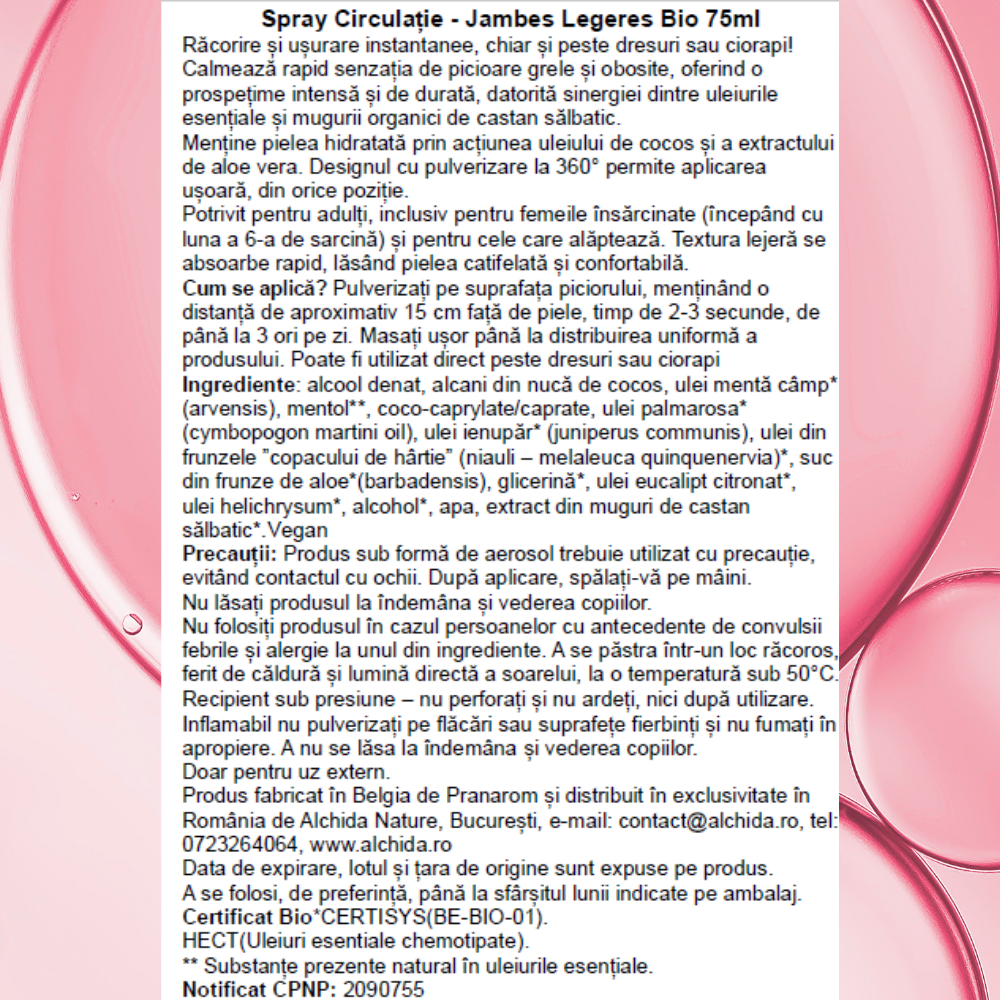 Sprayul Circulație – Jambes Légères Bio este formulat cu rigoare științifică în laboratoarele Pranarôm din Belgia, combinând expertiza în aromaterapie cu cele mai avansate principii ale fitoterapiei moderne. Fiecare ingredient este ales cu precizie pentru a oferi o senzație rapidă de prospețime și o acțiune eficientă împotriva disconfortului cauzat de picioare grele, obosite sau tensionate.