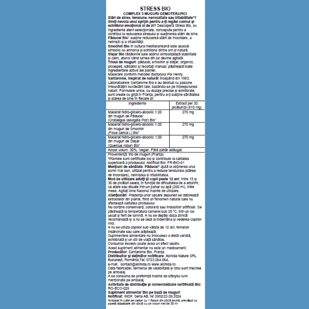 Tricomplexul de muguri bio, recoltați manual din floră spontană potențează efectul acestei rețete unice. Maceratele Santarome Bio sunt preparate după rețetele părintelui gemoterapiei moderne, doctorul Pol Henry, 1/3 apă + 1/3 alcool + 1/3 glicerină ținute la macerat timp de 21 de zile cu o diluție de 1:20 (dintr-un kilogram de extract prin diluție se obțin 20 de kg de produs).