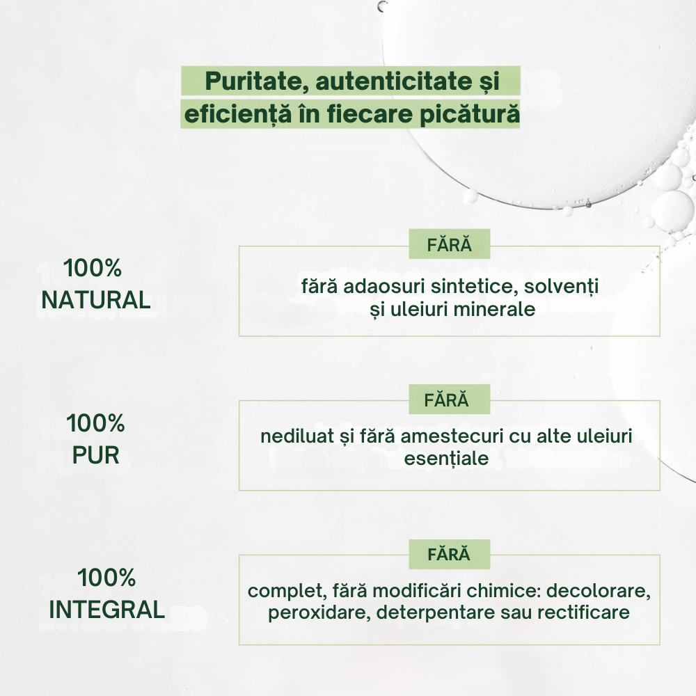 100% PUR – nediluat și fără amestecuri cu alte uleiuri esențiale.