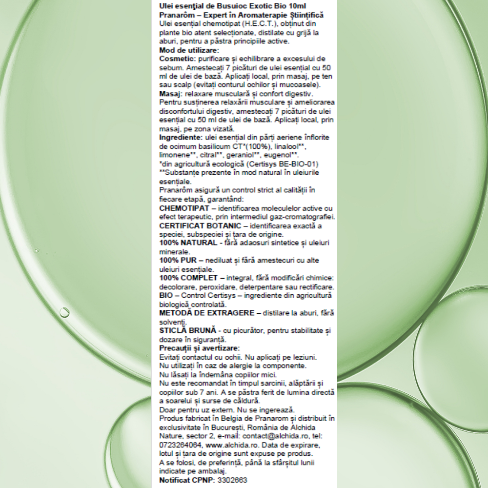 Acest ulei esențial de Busuioc Exotic este obținut prin distilare delicată la aburi din plante bio atent selecționate, pentru a păstra nealterate principiile active unice: linalol, trans-bergamotene și 1.8 cineol. Cu un control strict al calității și o certificare botanică riguroasă, Pranarôm garantează un produs 100% natural, pur și complet, fără adaosuri sintetice sau modificări chimice.