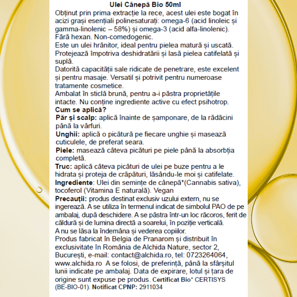 Uleiul de Cânepă Bio 50 ml este obținut prin prima presare la rece a semințelor de Cannabis sativa, păstrând integral complexul de acizi grași esențiali și fitonutrienți activi. Fără solvenți chimici, fără hexan, acest ulei pur valorifică întreaga putere nutritivă a plantei pentru a hrăni, calma și proteja pielea în mod natural. Textura sa lejeră și capacitatea ridicată de absorbție îl fac ideal atât pentru îngrijirea zilnică a pielii, cât și pentru tratamente cosmetice și masaje relaxante.